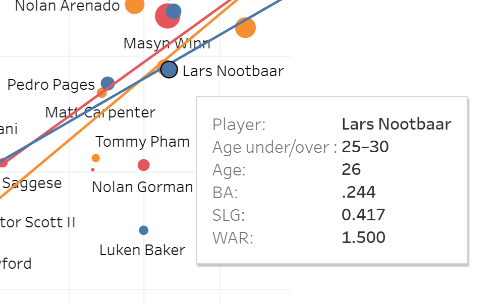 This dashboard explores the relationship between batting average and slugging percentage for Cardinals hitters, helping highlight different hitting styles across the lineup.
